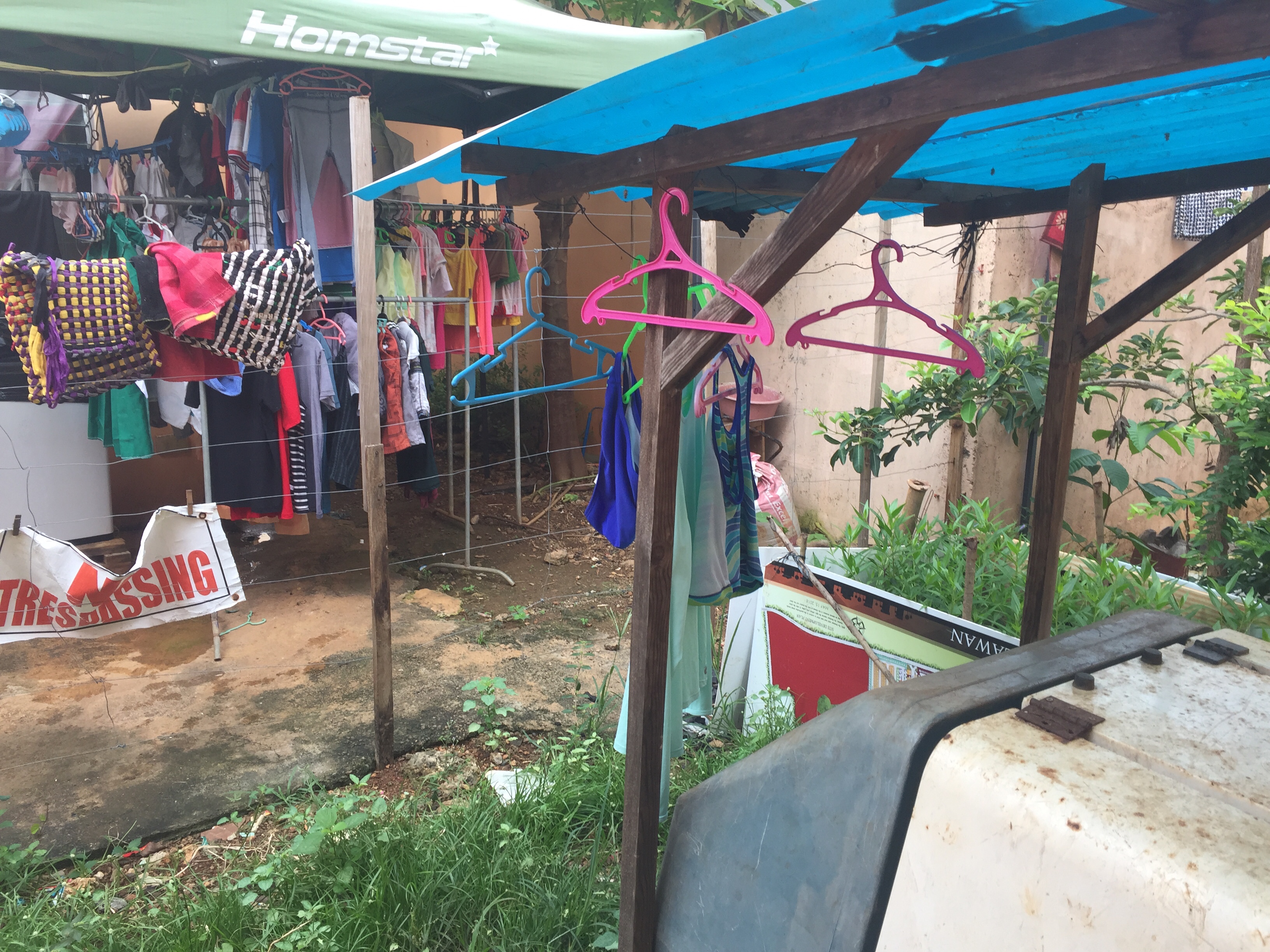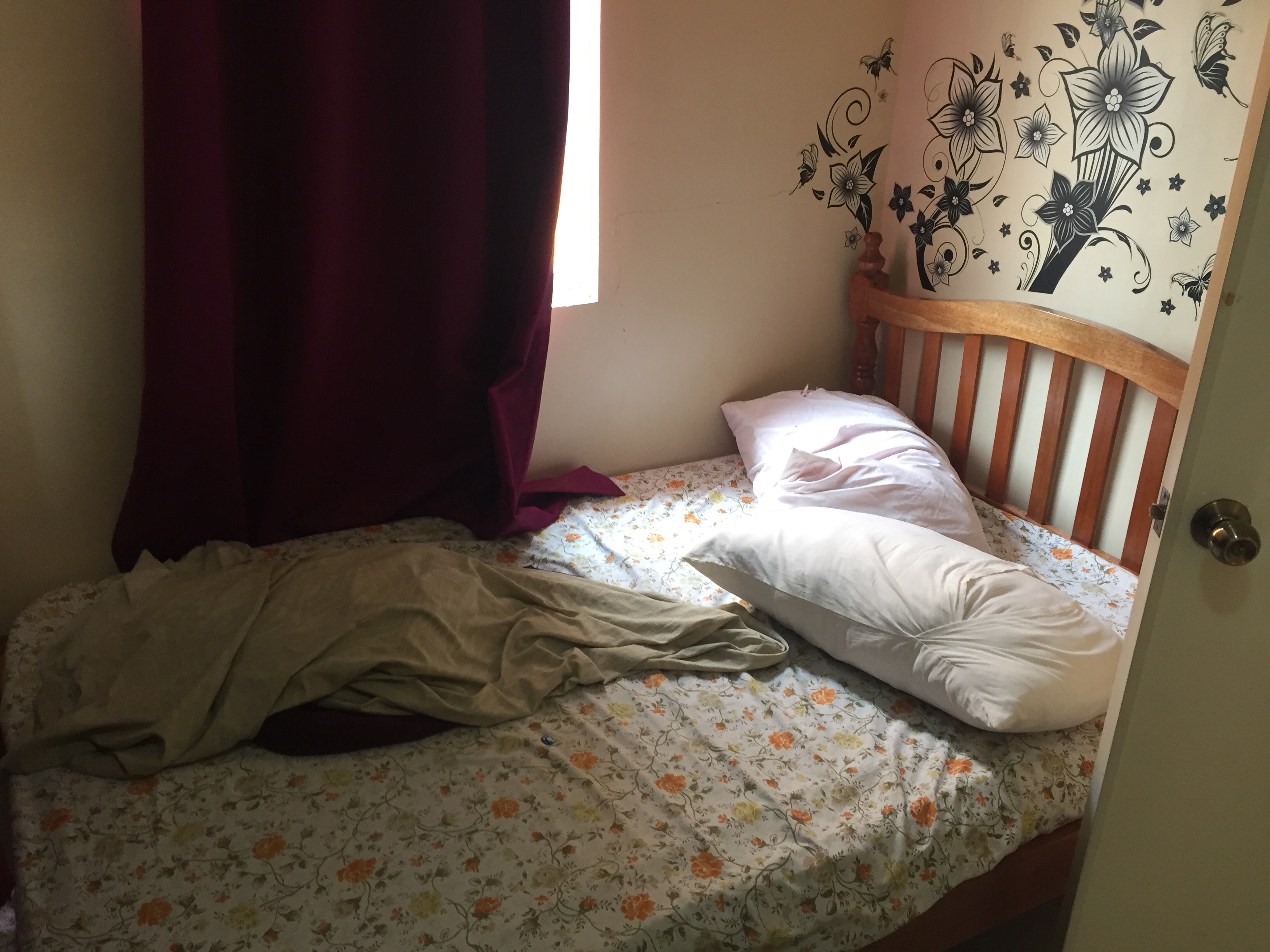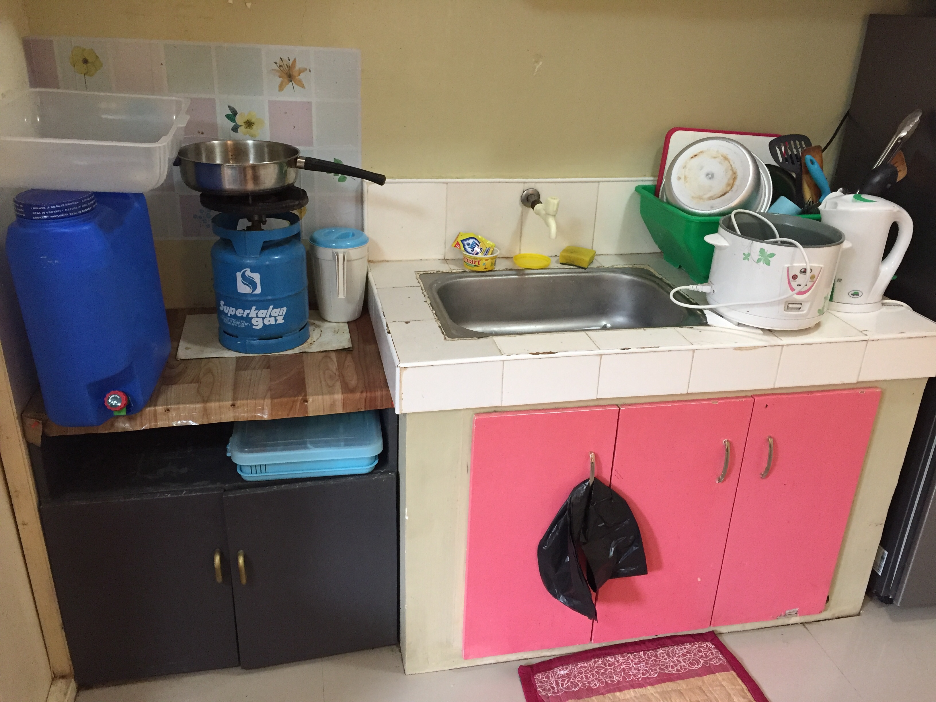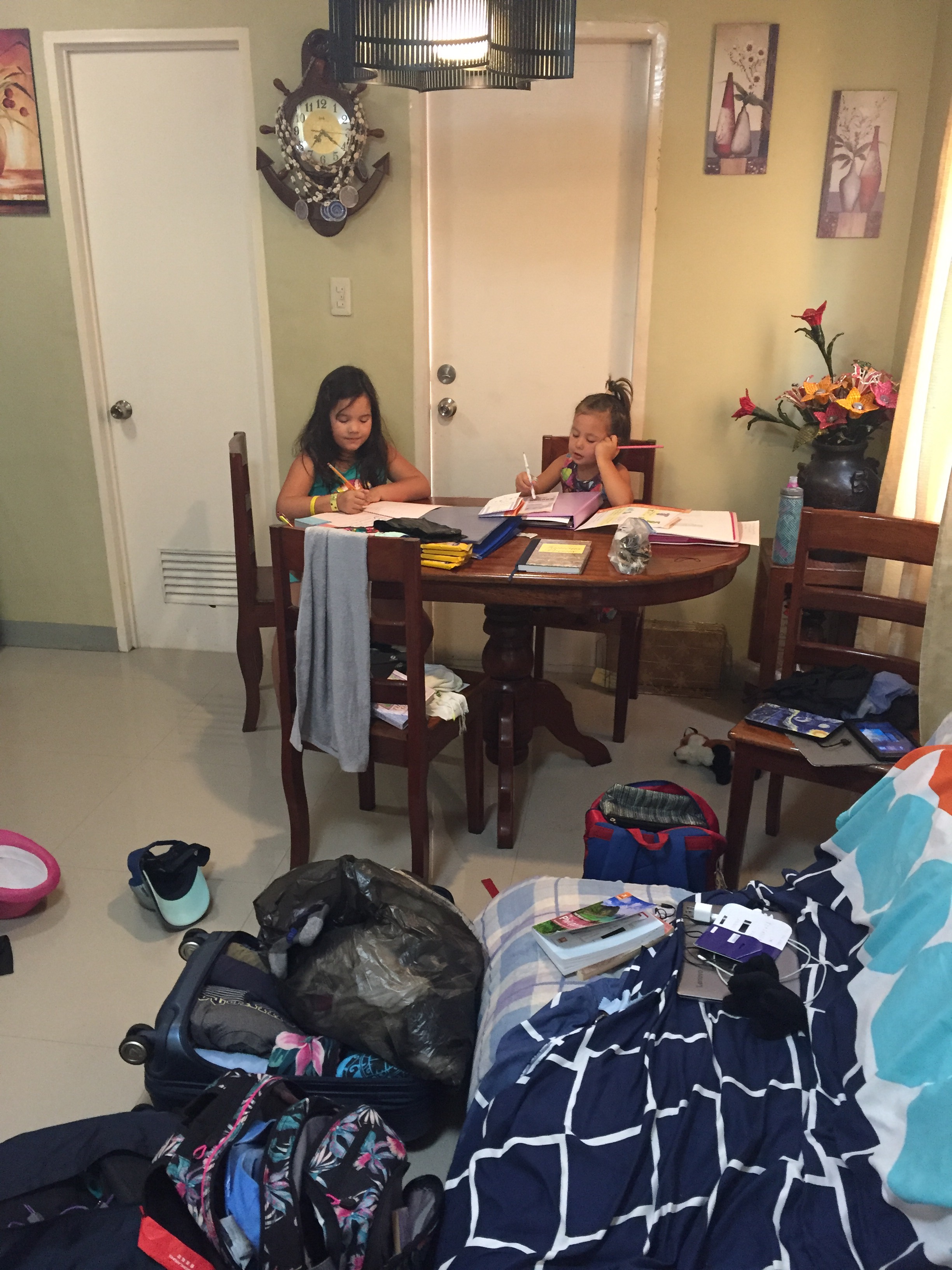 Kitchen: drinking/cooking water in the blue jug on the left, blue propane tank with burner as stovetop (light with a match and turn on the gas) pan on top, sink (way more time washing without a dishwasher, and also paranoia about the tap water meant we boiled our washing water…I’m guessing this may change as our lazy overrides our worries). Electric teapot for boiling said water, rice cooker and fridge. What more could we want? Clothes lineHad to put this picture in of the cat decal on the stairs because it scared (startled) the heck our of us nearly every time we went up the stairsPile of real cats that also made me jump when I went to hang up our clothesBed where I could touch the wall with my feet if I pointed them (ok, if I put my head against the headboard maybe not quite unless I tried, but yes with the inch of space that makes a pillow comfortable). To its credit the mattress was more comfortable than the girls’ (due to the girls’ mattresses being about half as thick – discovered by me when I slept on Marion’s bed-ow says my hips)Really not meaning to complain, we all seemed to sleep well and I was 100% grateful for the A/C (though in all honesty it was sort of hilarious how we’d dial it up and then I’d be so cold I couldn’t sleep and there are only sheets so I would use the little towels to spread over my feet or shoulders but if we turned it off or down I’d wake up too hot! Oh goodness my narrow window)Couch, table, door to left is bathroom which did actually have hot and cold water and a sprayer, tabo, and toilet paper. No lack of options. If we’re being truthful it was not perfect in its smell (mostly just the bathroom) but we’re still not on the complaining wagon yet 🙂