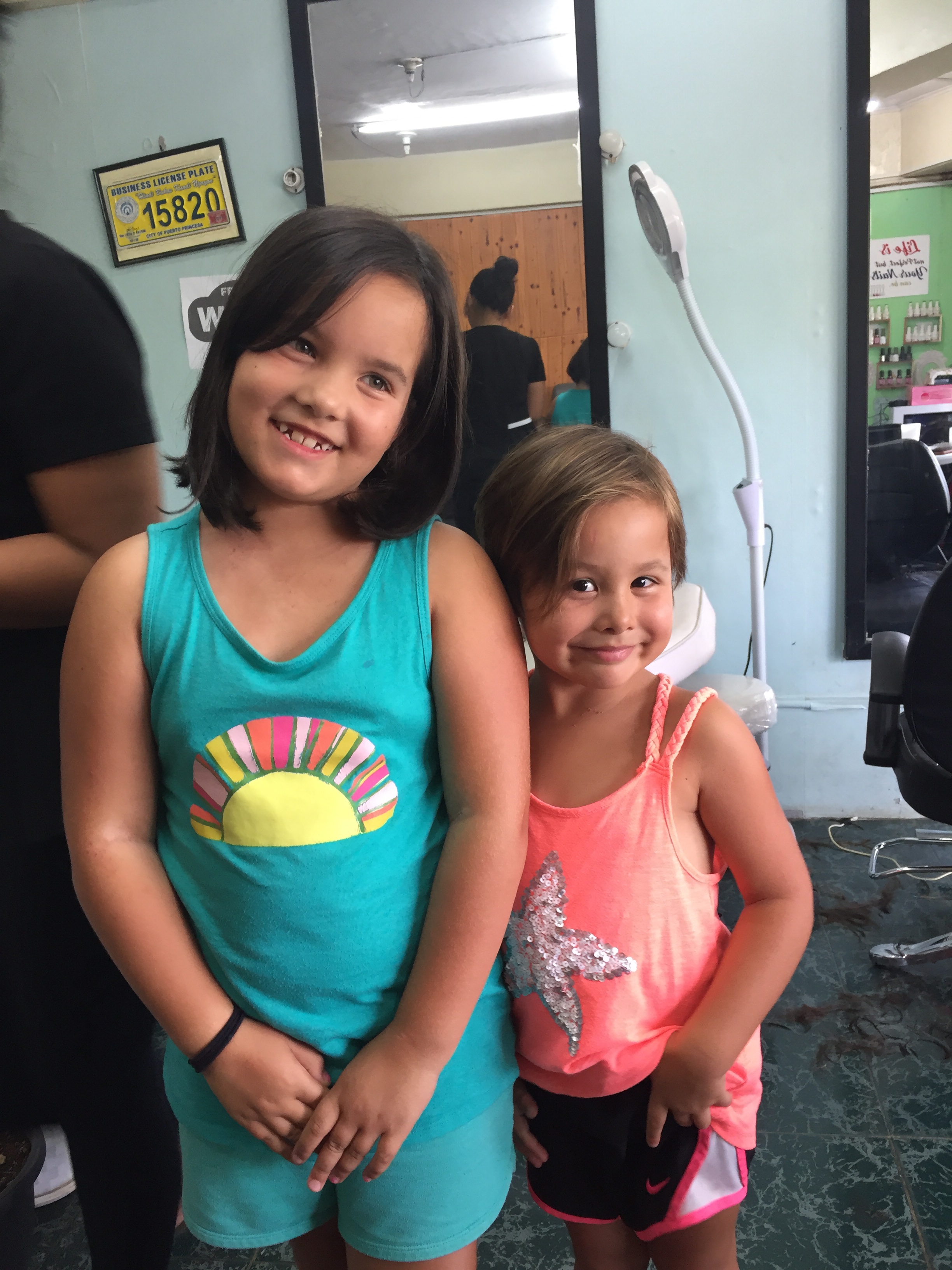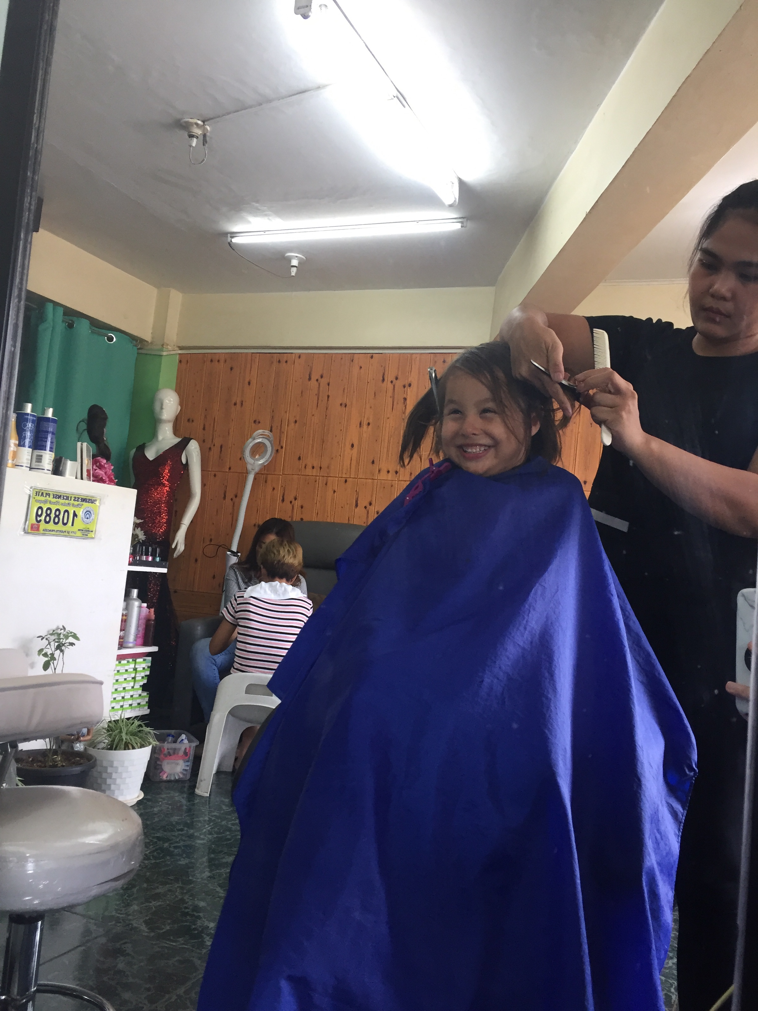 We went wandering the streets of Puerto Princesa and we have been talking nearly daily of cutting all this hair off. Marion has been pushing for weeks to shave her hair off “like Dad!” And her focus has only intensified. So when we saw a little salon with $1 haircuts…we’ll, that seemed about he right price for their first haircuts that haven’t been by me! Ha! Unfortunately for Buoy the woman refused to shave her hair 😂. Not on a girl!! They were mollified that we requested a short pixie cut similar to the other woman working there at the moment. Marion was thrilled to see her hair dropping away. Though she was really ready for a shave. Oh that girl.