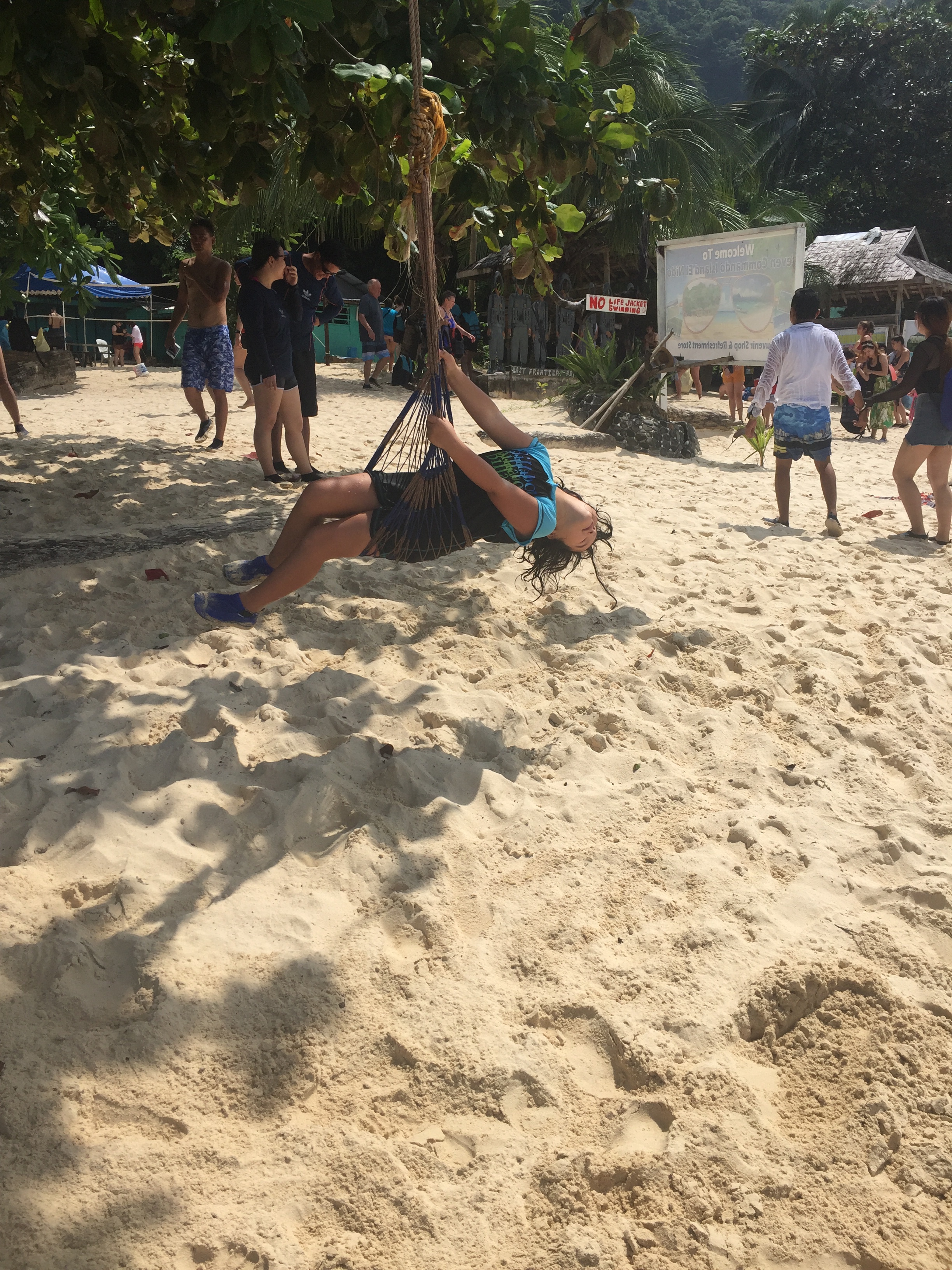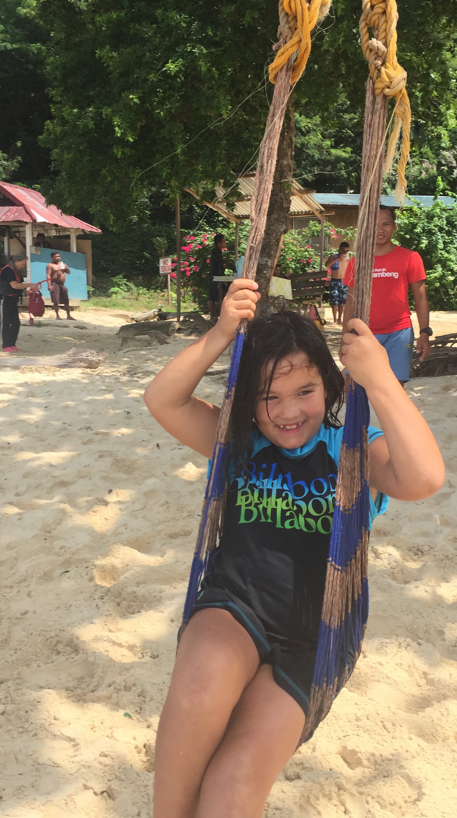At our first stop it was mostly hundreds of sea cucumbers, which really aren’t my favorite as hey remind me of fat lazy eels or snakes…both of which make my skin crawl. But we did see a lion fish! And Alys took a ride on the giant swing. And Marion just wants to swim and play in the sand. Not a surprising wish with such water and silken sand.