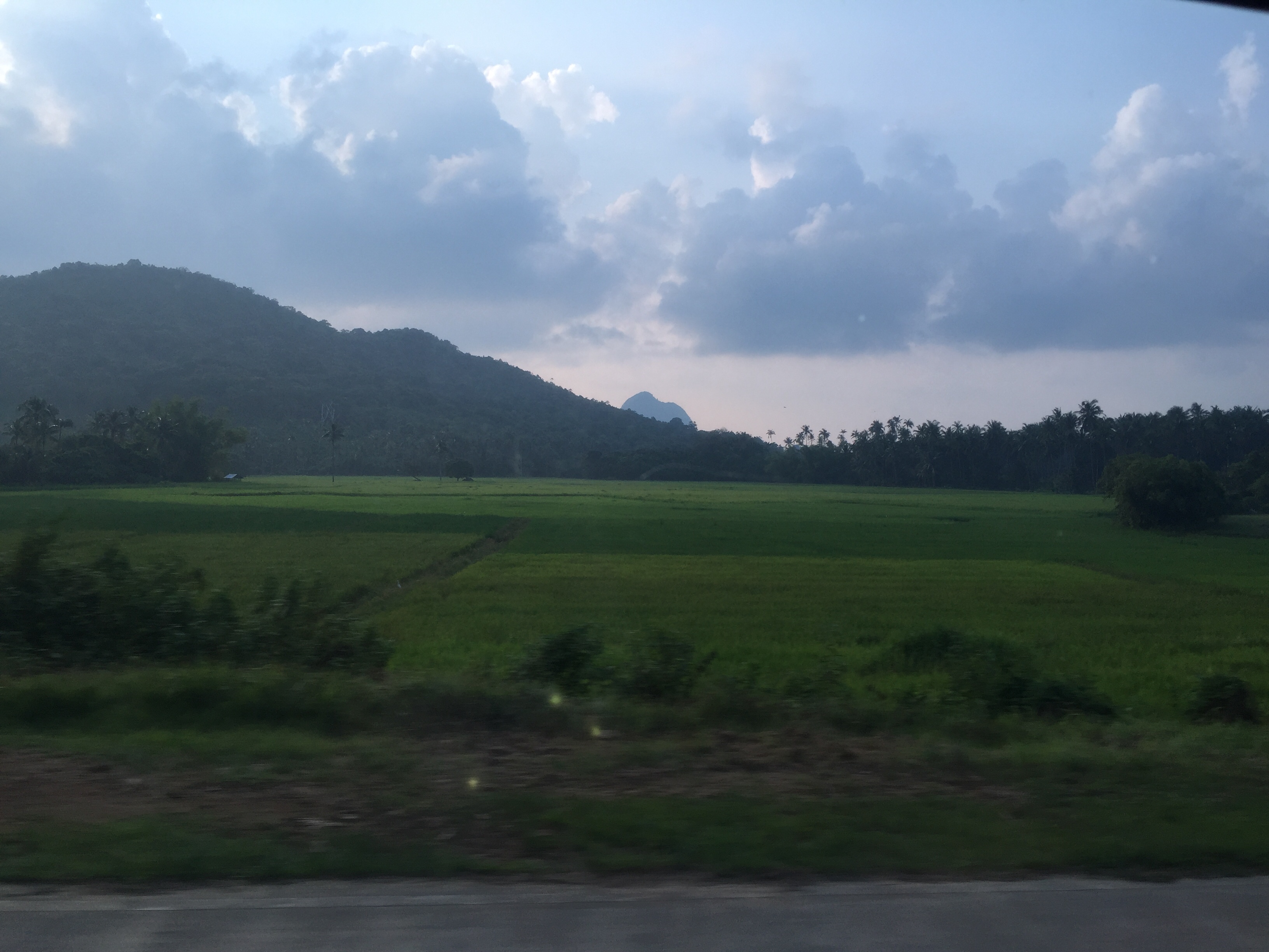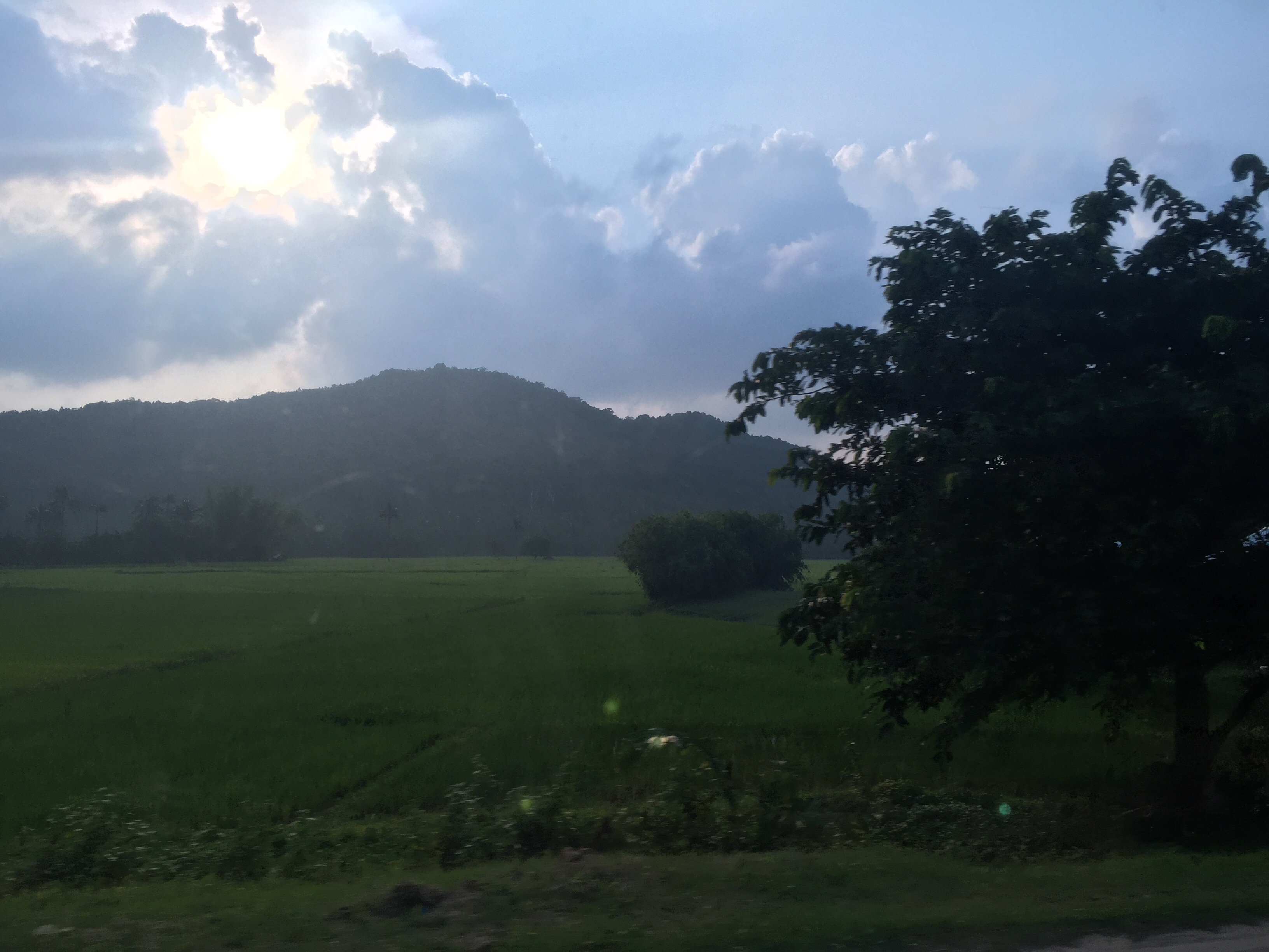 And beyond the very unpleasant ride, there were quite a few lovely views. Picturesque justs kept coming to mind. We drove through a lot of…what must have been farmland, loads of rice paddies…in all shades from murky brown water, to shoots of new green, to rich waving grass, to browning tips. And of the many fields, only once did I see a motorized plow, but mostly the traditional image you conjure up in a rice paddy: large gray carabao (Brahma looking cow with the large stick out chest waddle and big horns) pulling a wooden framed plow with a man in shorts up to his calves in the mud behind. For some reason I didn’t expect to see this until Thailand, or Vietnam. Guess I didn’t do enough looking at he Philippine guide books. Happy surprise 🙂