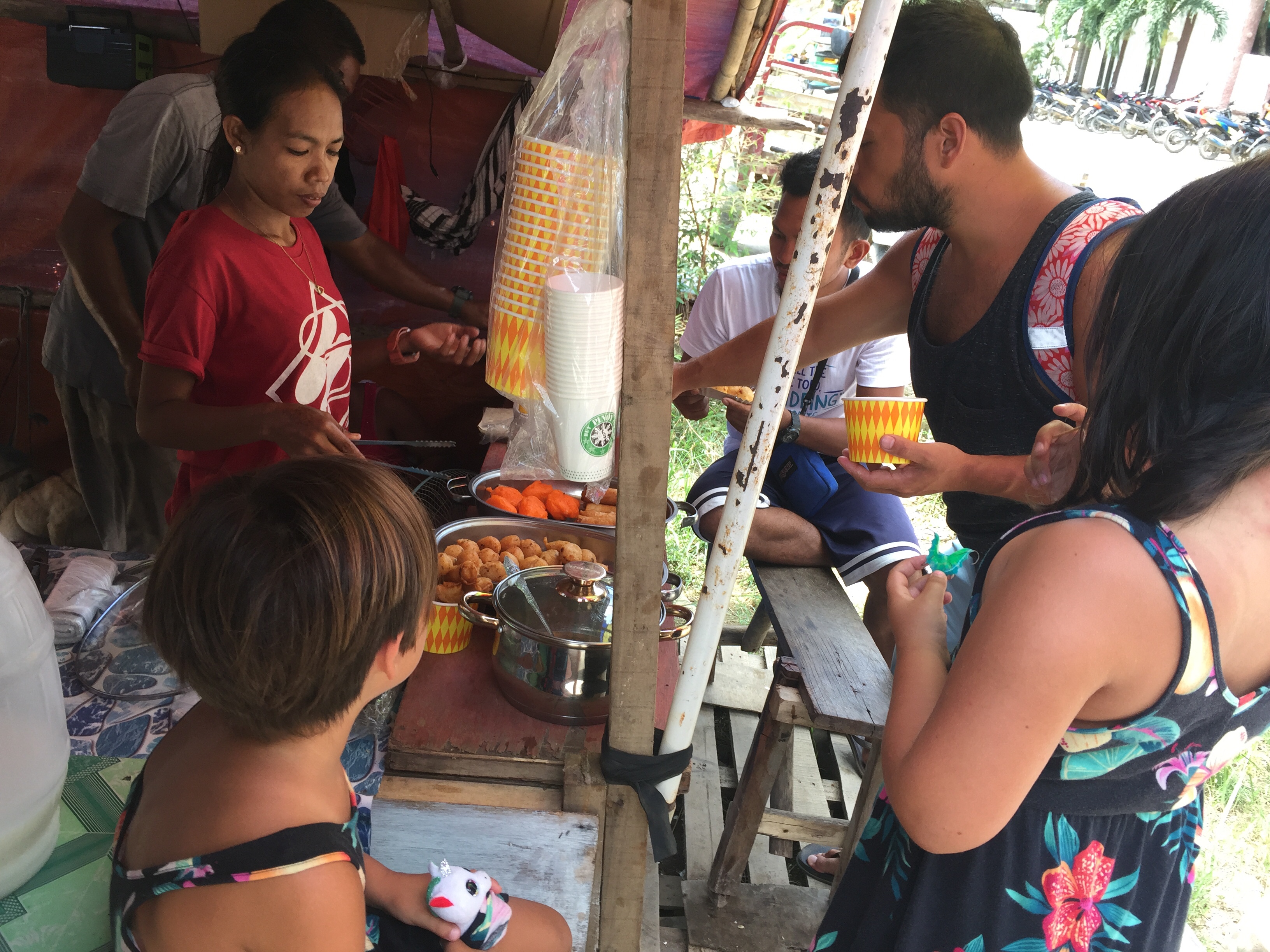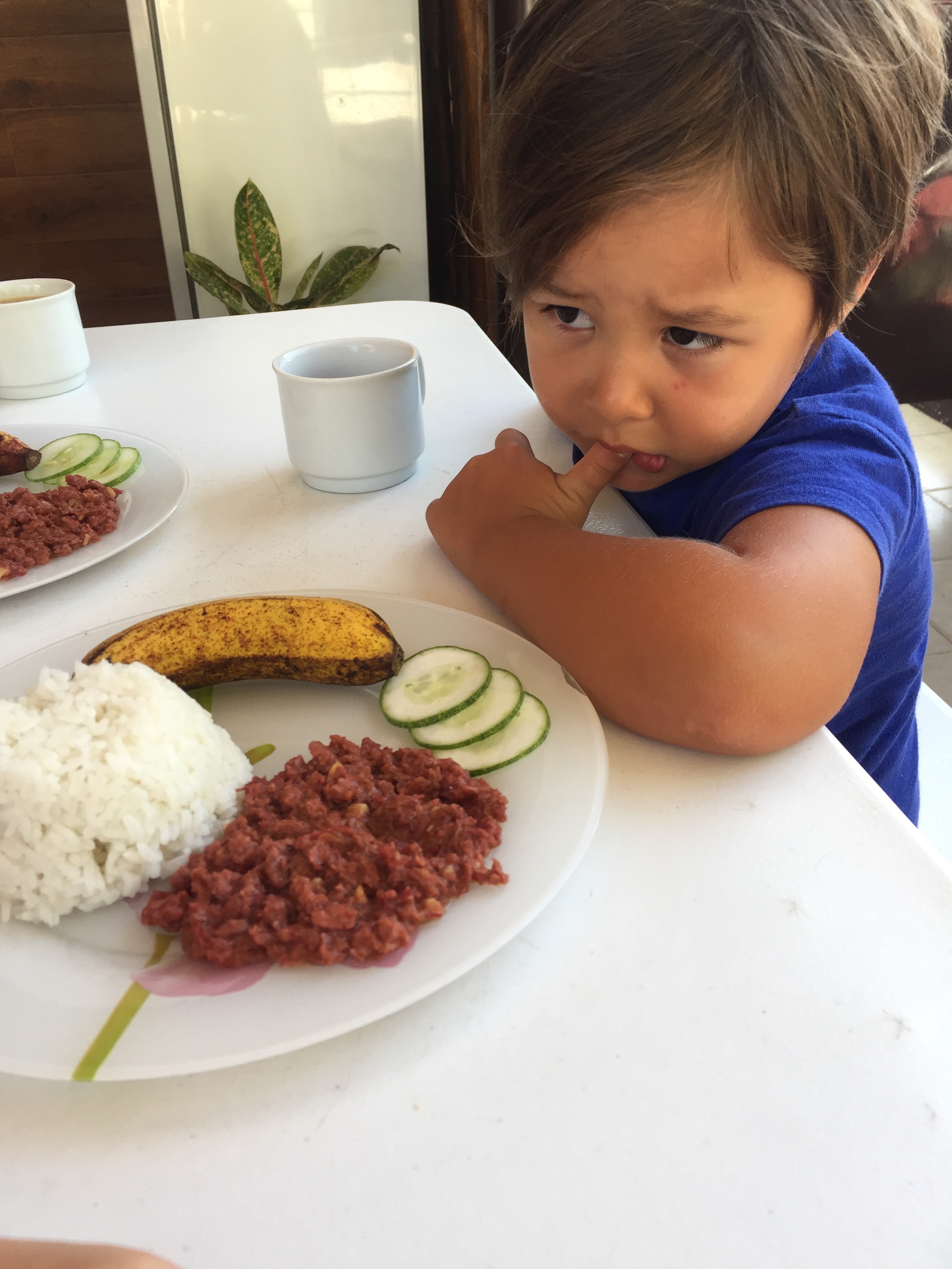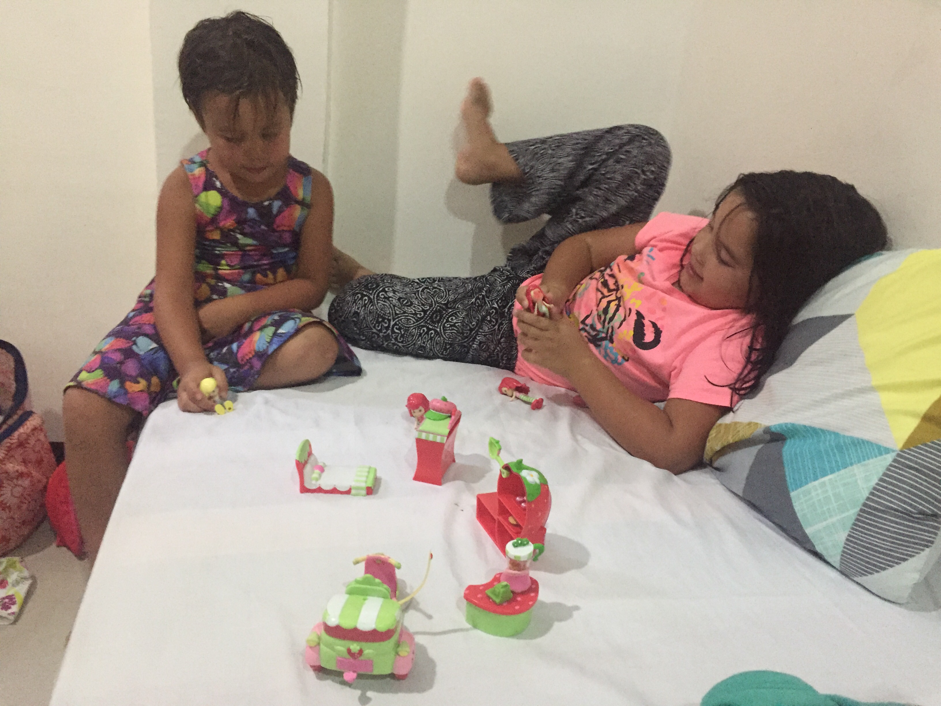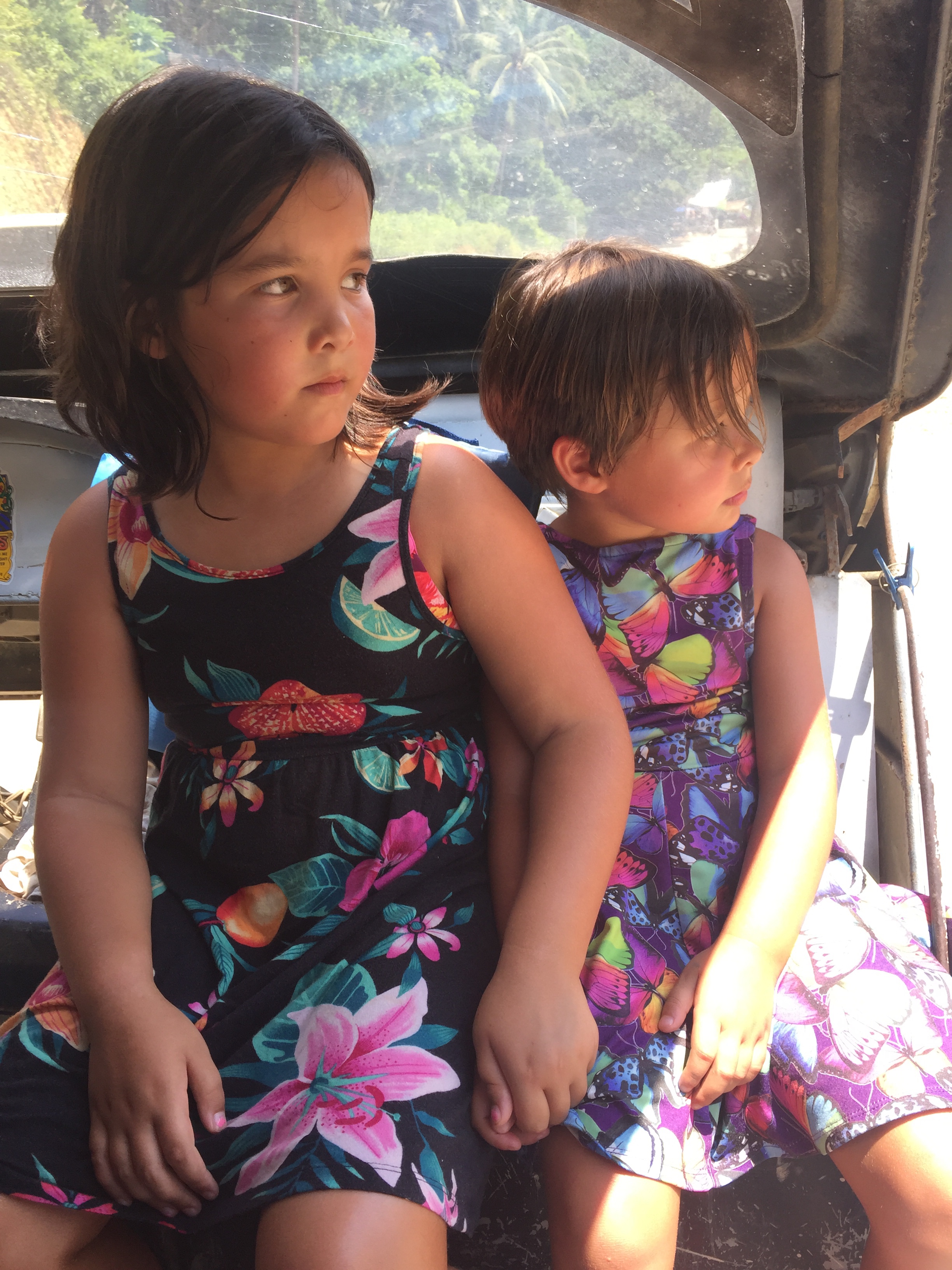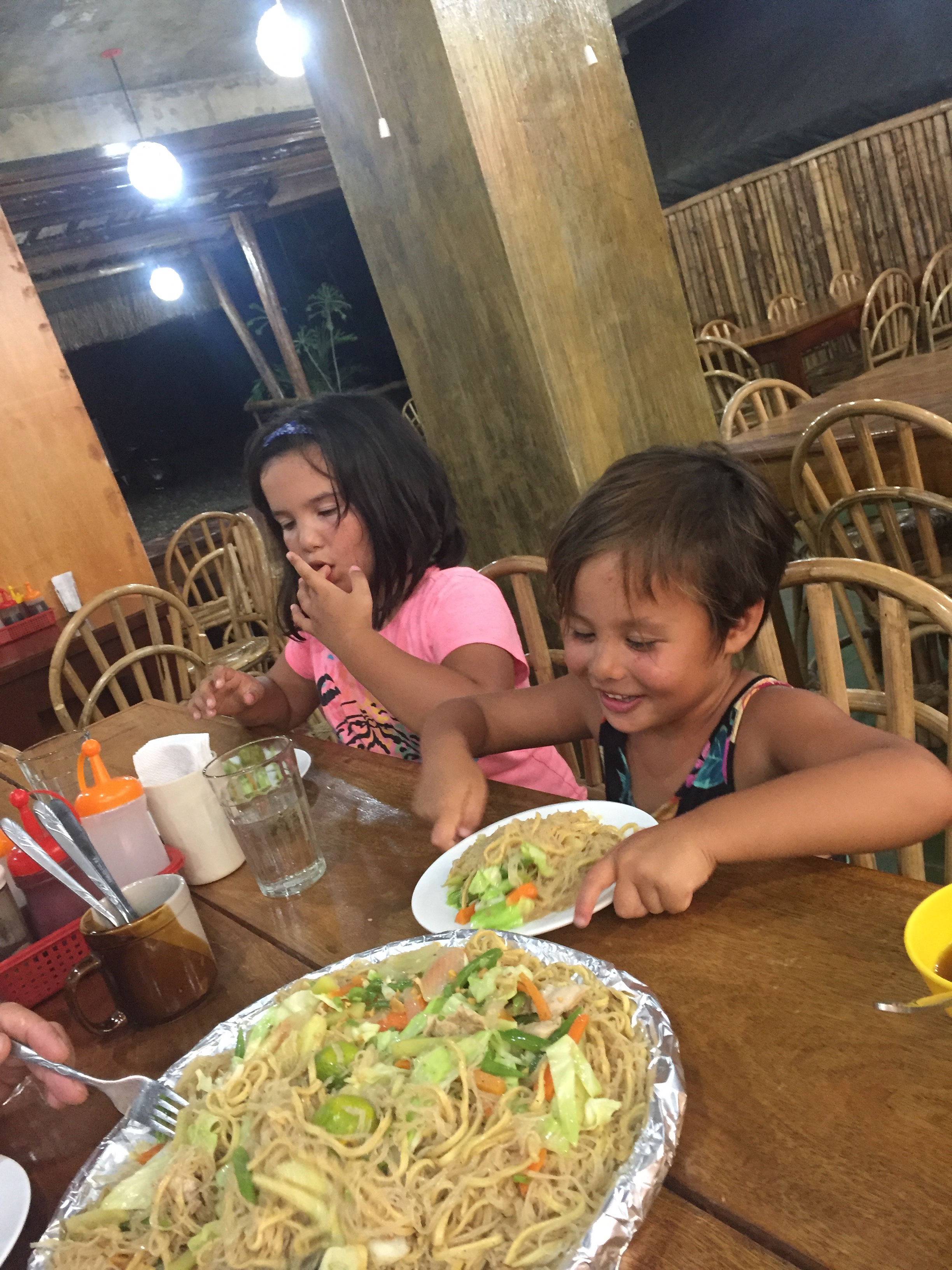 Fresh from the pan fried lumpia and squid balls (a little squid in dough balls) from a roadside standLocal market with the usual fruits and vegetables, fish, meat, live chickens, bambooFilipino breakfast is usually a hit with this crew, but Marion would like her corn beef swapped for eggs please. I think that’s what this face is saying.A little strawberry shortcake anyone? Please…pretty please could someone pop this way, because Mom is real bad at he imaginary play after we’ve baked all of the things and gone for a ride for our picnic. So happy when the girls are contented playing with each other. They’ve been really good together (not without their fights, but overall awesome).Sweet, hot sisters on the way to the beach. Another trike ride. Our boudoir (and living and dining and laundry and play room and parlor and office 😆😁) chad and I fit in the bottom bunk and Alys on top. Thank goodness we instituted the rule that she slept by the wall and Marion had to sleep on the lower twin (from where I’m taking the picture). Because no rail on the top bunk and the fall from the twin to the floor was enough to hurt Marion’s head enough that Mom stayed up from midnight to 4am gently rousing her every 30 minutes to make sure she didn’t have a head injury. That’s how that works right 🙄🤦♀️. Oh heavens the poor girl. She has fallen and hit her head I think 3 times or more already on this trip. Resilient these girls. More market wanderingI am definitely putting more ginger in all of my foods. So good!A long hot day calls for a mango shake. Yum!Marion working in her “secret language” that only SHE can read and speak. “It’s a lot of hard work writing this whole page!”How’s school for our folks back home? We think we’re doing ok, but I really probably need to do a bit more educating of myself on this teaching biz. Good thing we have such bright girls. Just a giant platter of pancit please