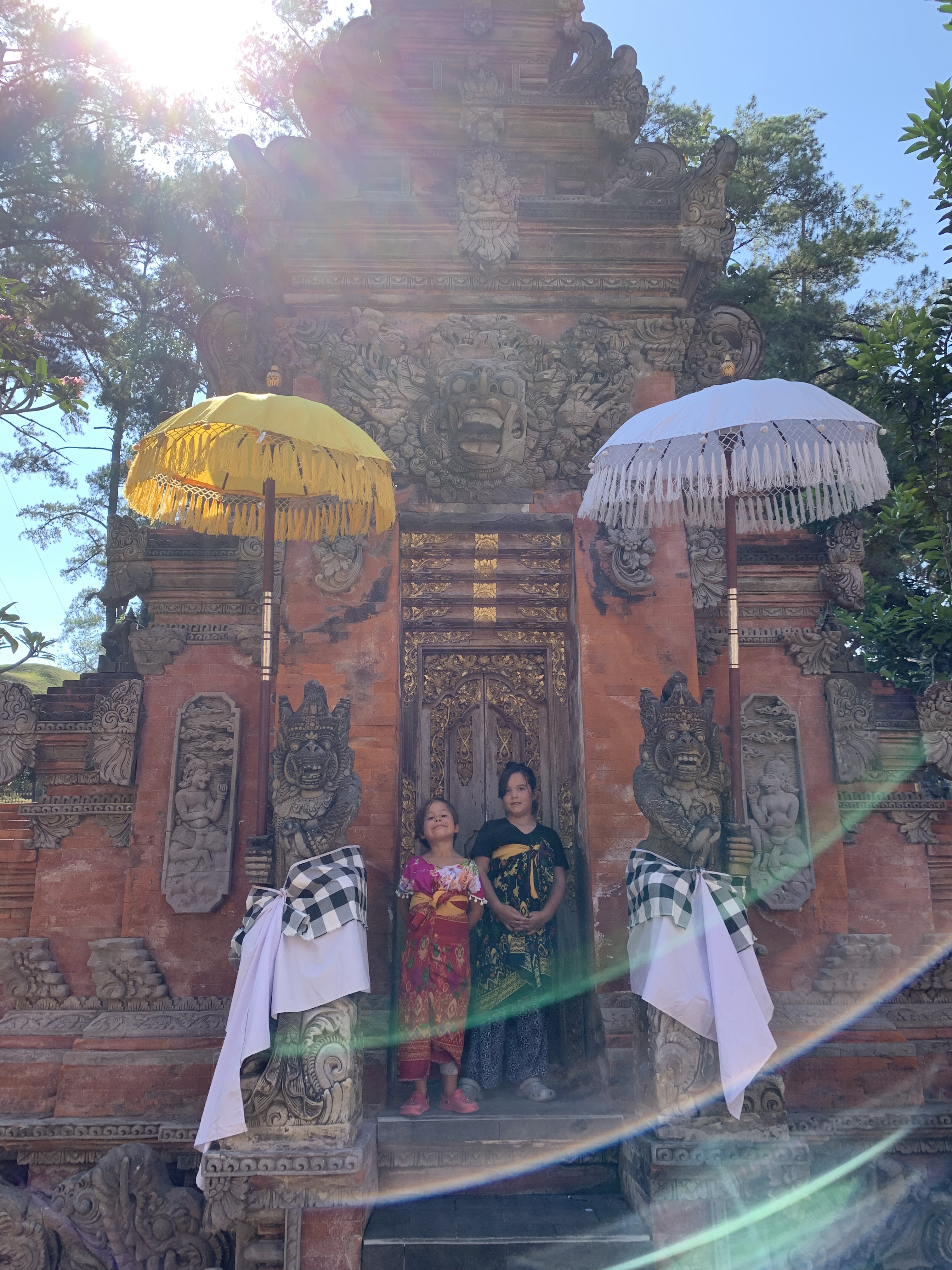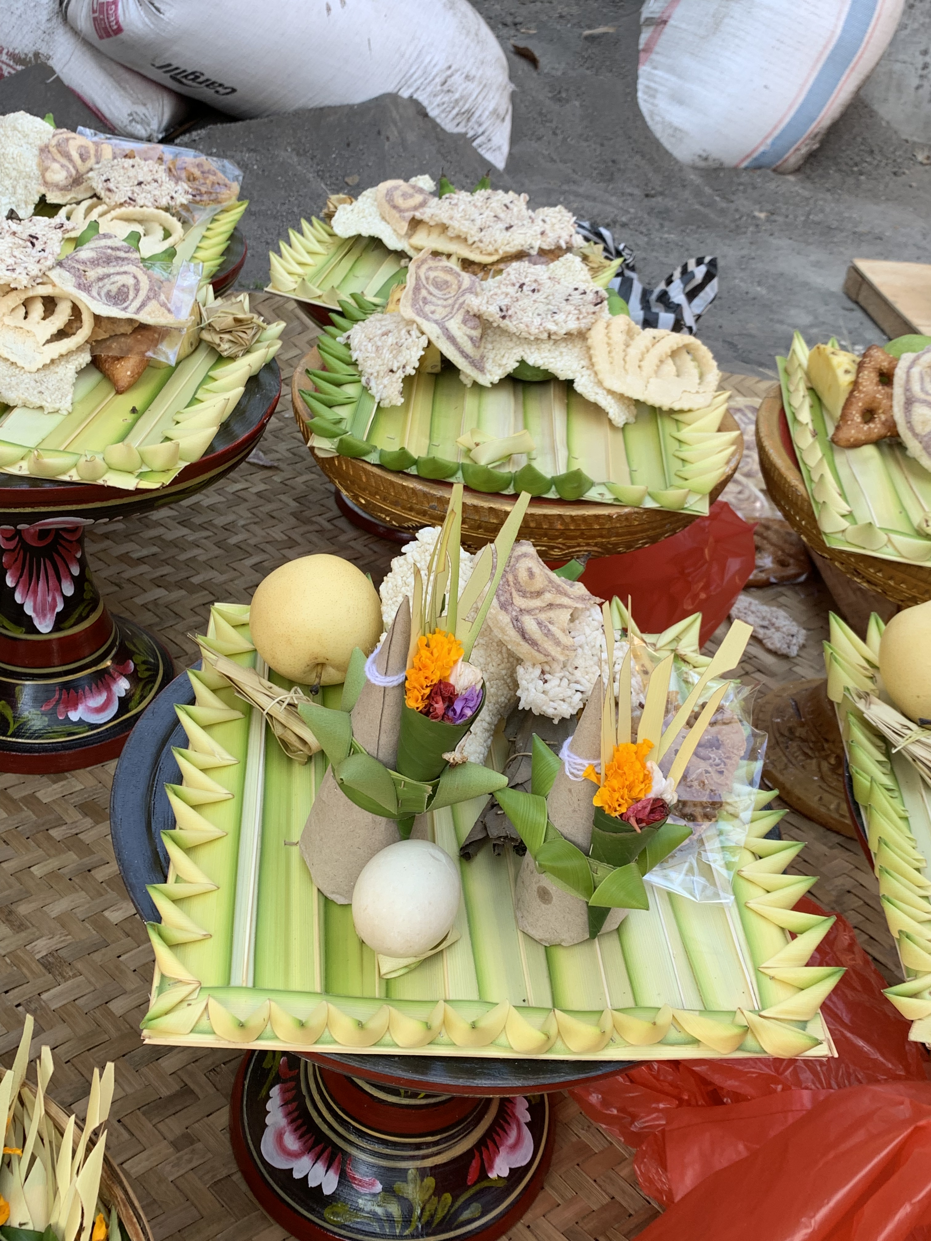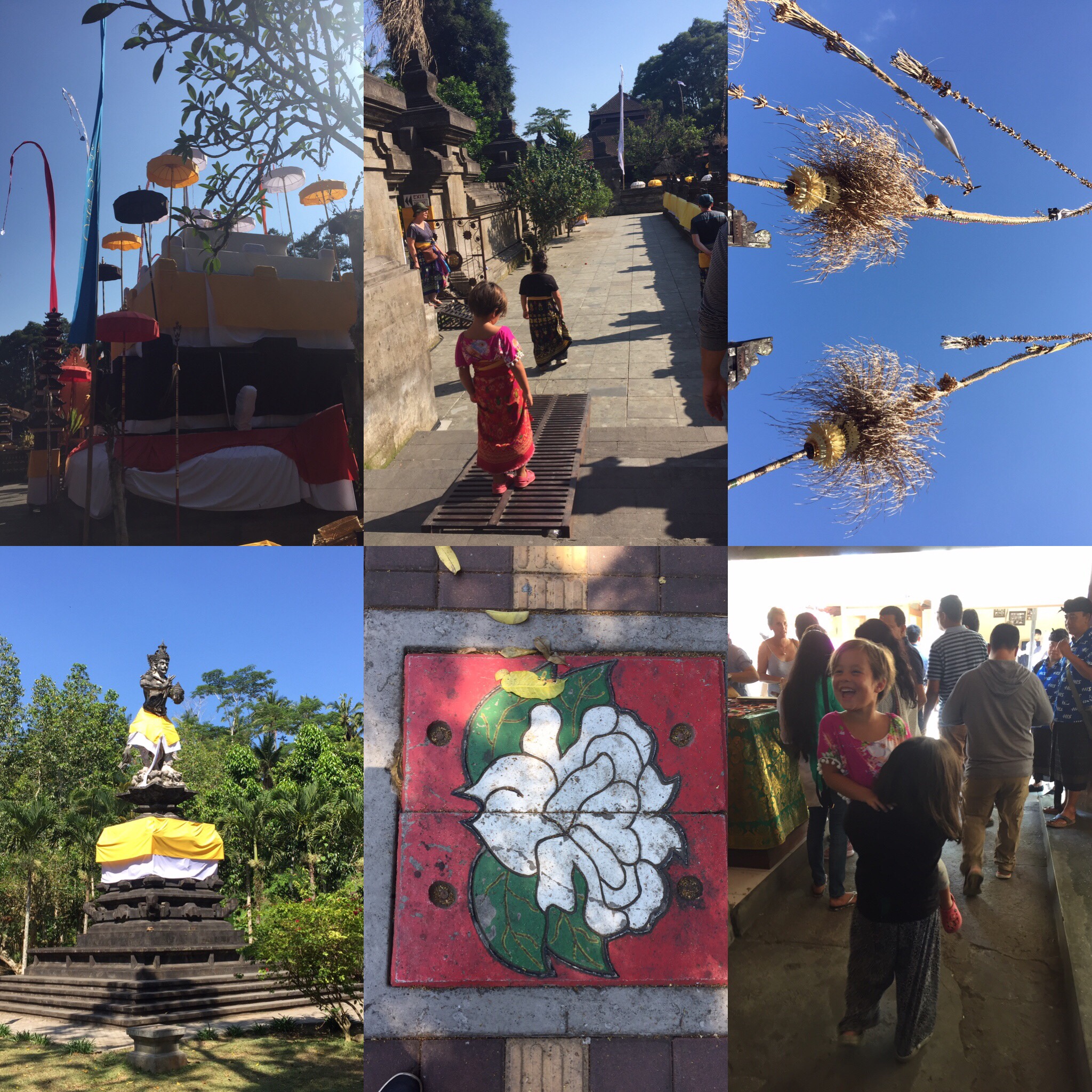The temple visit (again refer to my haranguing about discomfort of ruining a nice thing through over observation and commercialism) was beautiful and bless my husband for asking a ton of curious questions so that we learned way more about the colors representing directions and ruling ones person and the square v. triangular v. circular offerings and that one of the Barong’s was made entirely of pork including tripe/omentum umbrellas! Perhaps thank and even bless more our lovely guide Wayan for his patience. Side bar: Wayan is one of 4 names given to children in Bali, at least of the lower caste. there are only 2 names for the upper caste (one for boys and one for girls…i think this is correct) but the 4 for the lower caste are for either gender and are for the 1st, 2nd, 3rd and 4th children and if the family has more than 4 kids they just start over. I learned all this from our hostess at our homestay (also Wayan) who is one of 10 children. She told me she is Wayan number 3 for her parents. When I asked if they went by nicknames, she said “we all have surnames” so I guess maybe surname isn’t exactly the same as what we mean by surname. The language barrier is not insurmountable, but present.