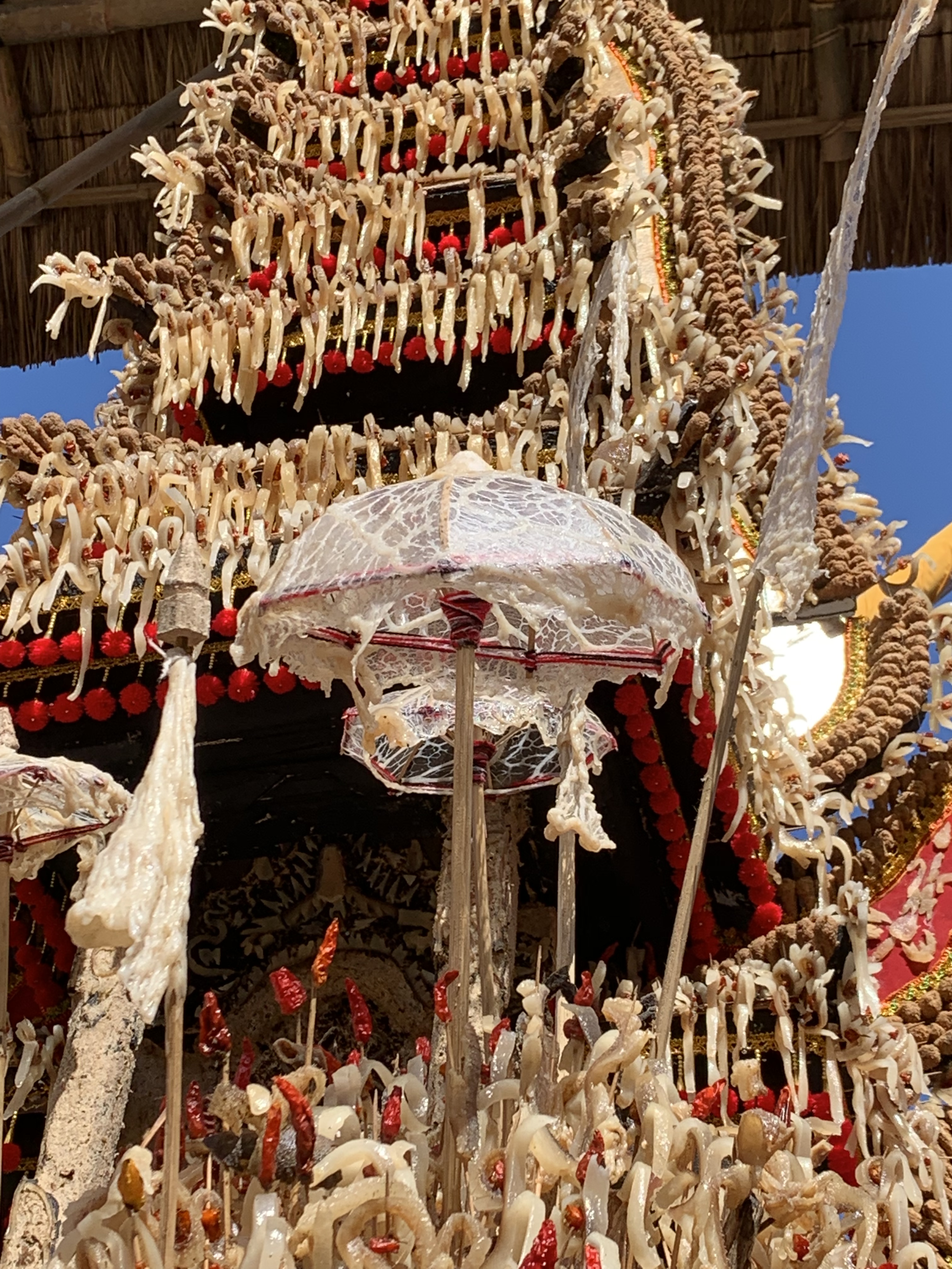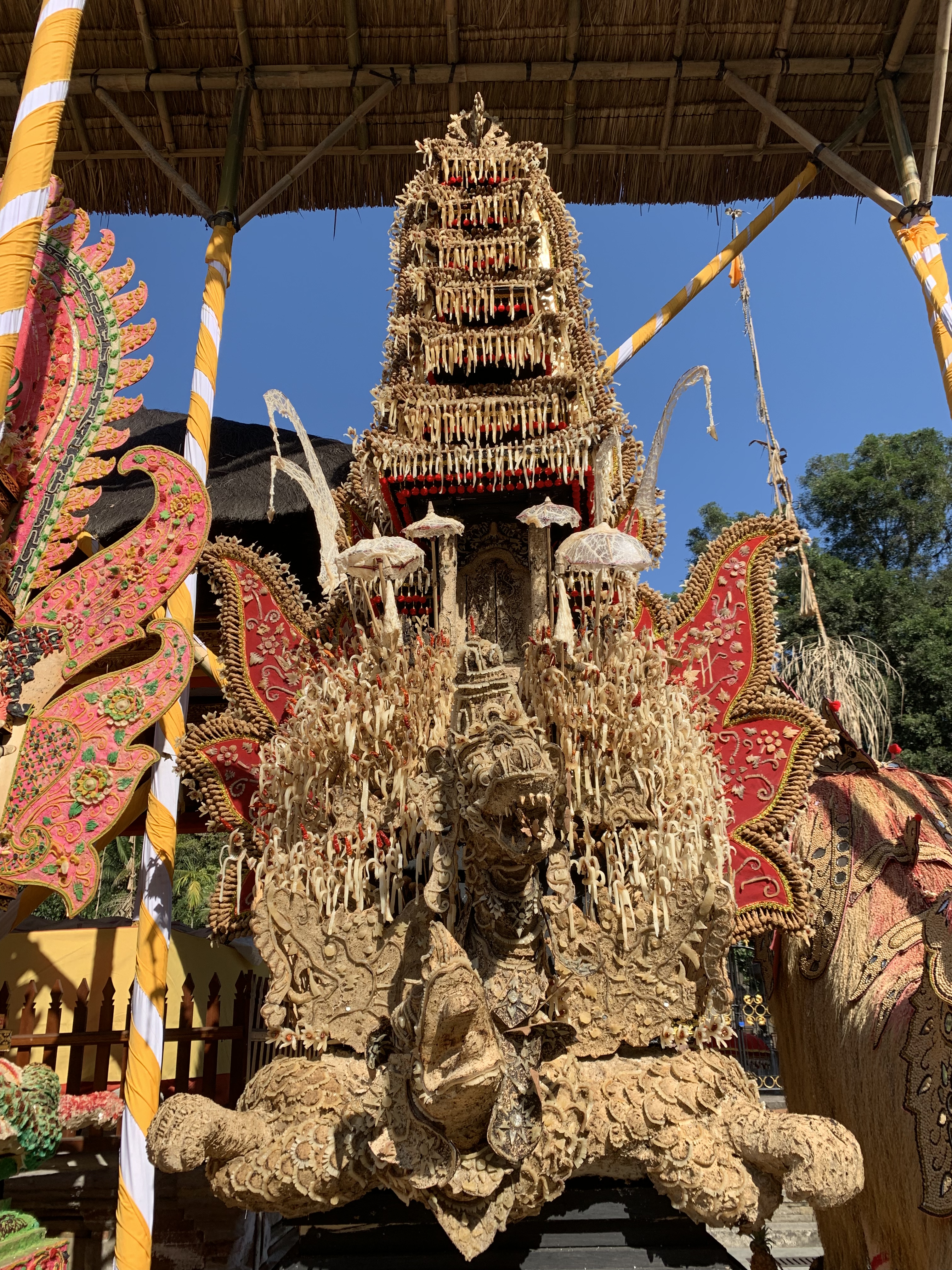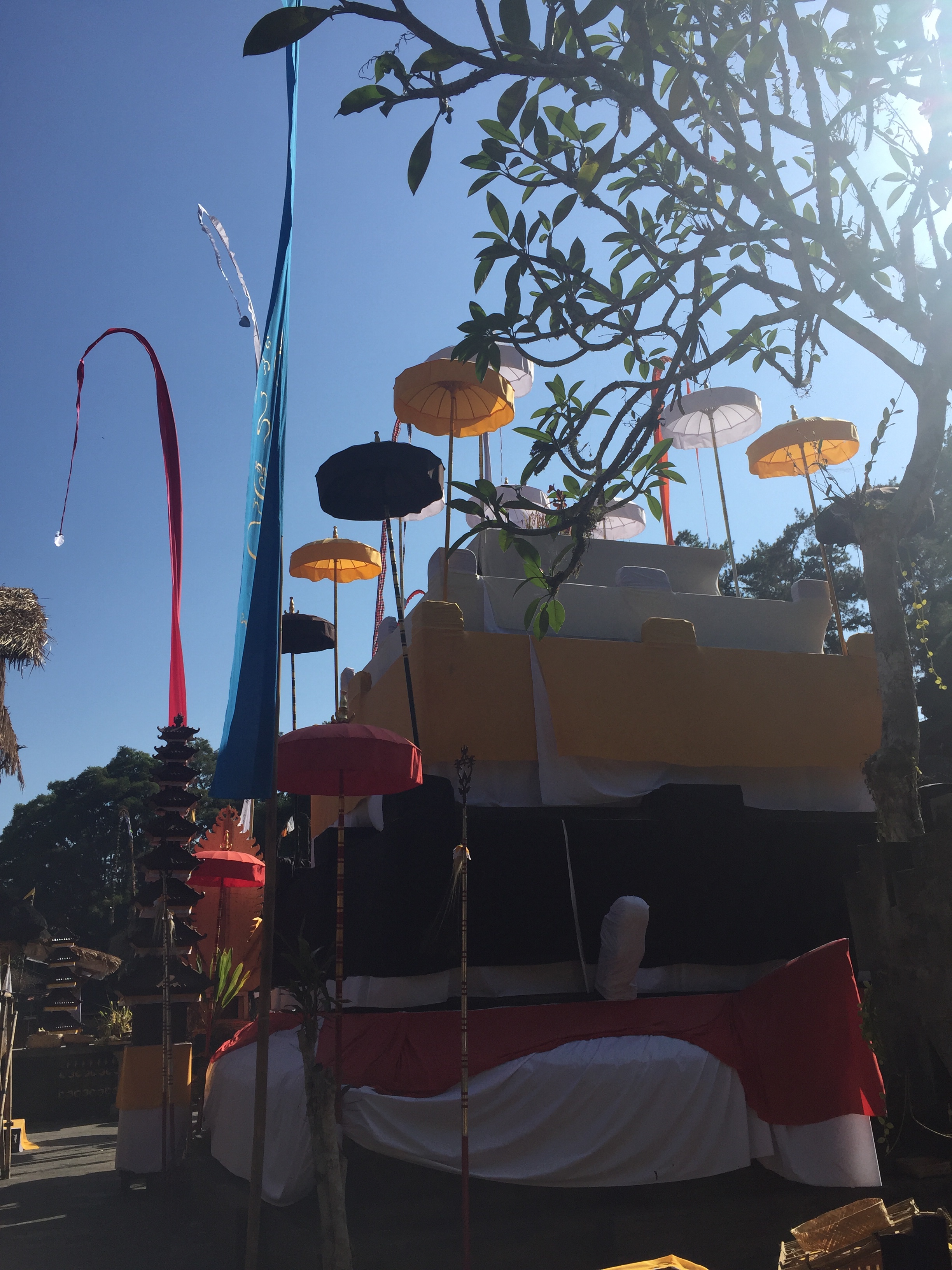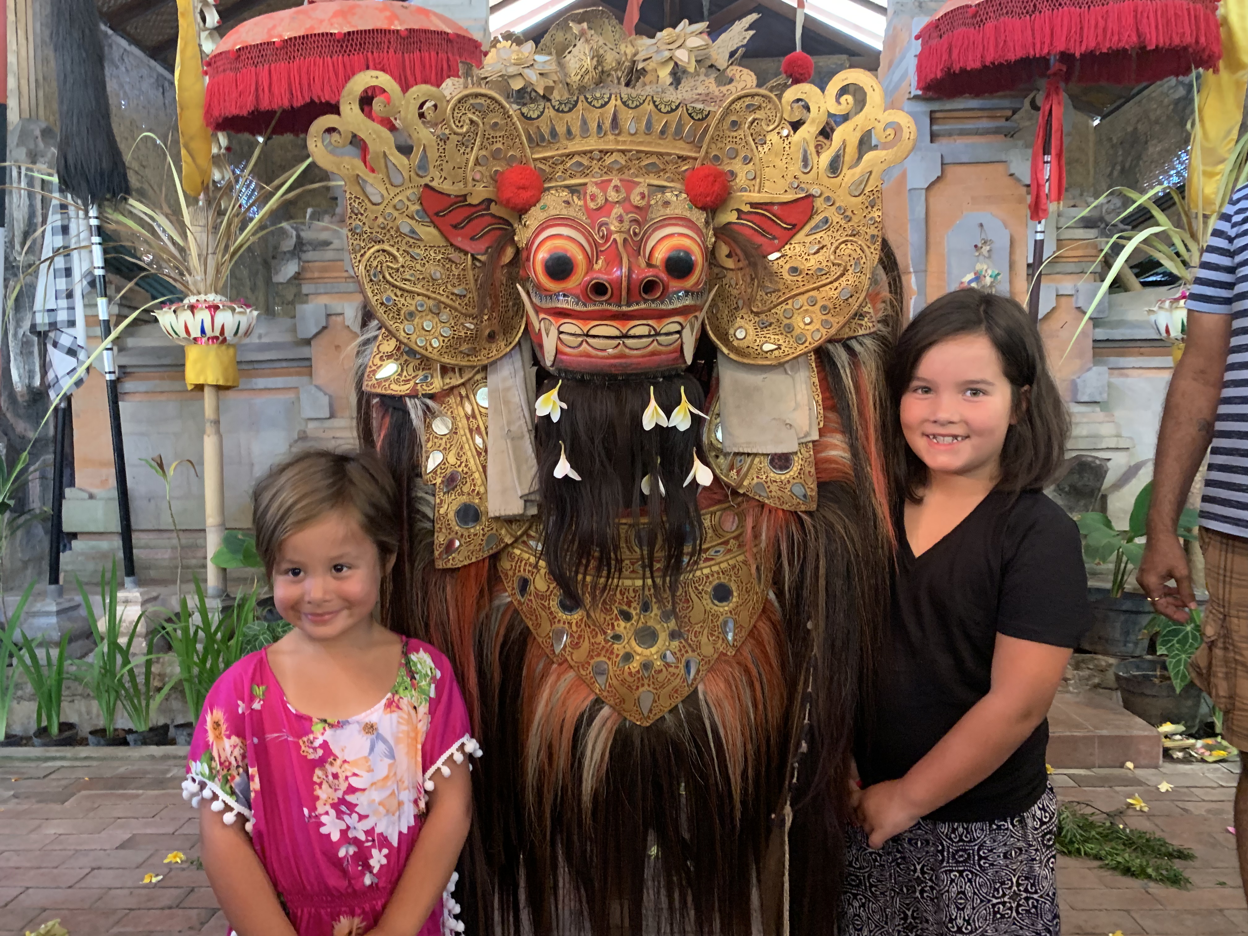The temple visit (again refer to my haranguing about discomfort of ruining a nice thing through over observation and commercialism) was beautiful and bless my husband for asking a ton of curious questions so that we learned way more about the colors representing directions and ruling ones person and the square v. triangular v. circular offerings and that one of the Barong’s was made entirely of pork including tripe/omentum umbrellas! Perhaps thank and even bless more our lovely guide Wayan for his patience. Side bar: Wayan is one of 4 names given to children in Bali, at least of the lower caste. there are only 2 names for the upper caste (one for boys and one for girls…i think this is correct) but the 4 for the lower caste are for either gender and are for the 1st, 2nd, 3rd and 4th children and if the family has more than 4 kids they just start over. I learned all this from our hostess at our homestay (also Wayan) who is one of 10 children. She told me she is Wayan number 3 for her parents. When I asked if they went by nicknames, she said “we all have surnames” so I guess maybe surname isn’t exactly the same as what we mean by surname. The language barrier is not insurmountable, but present.