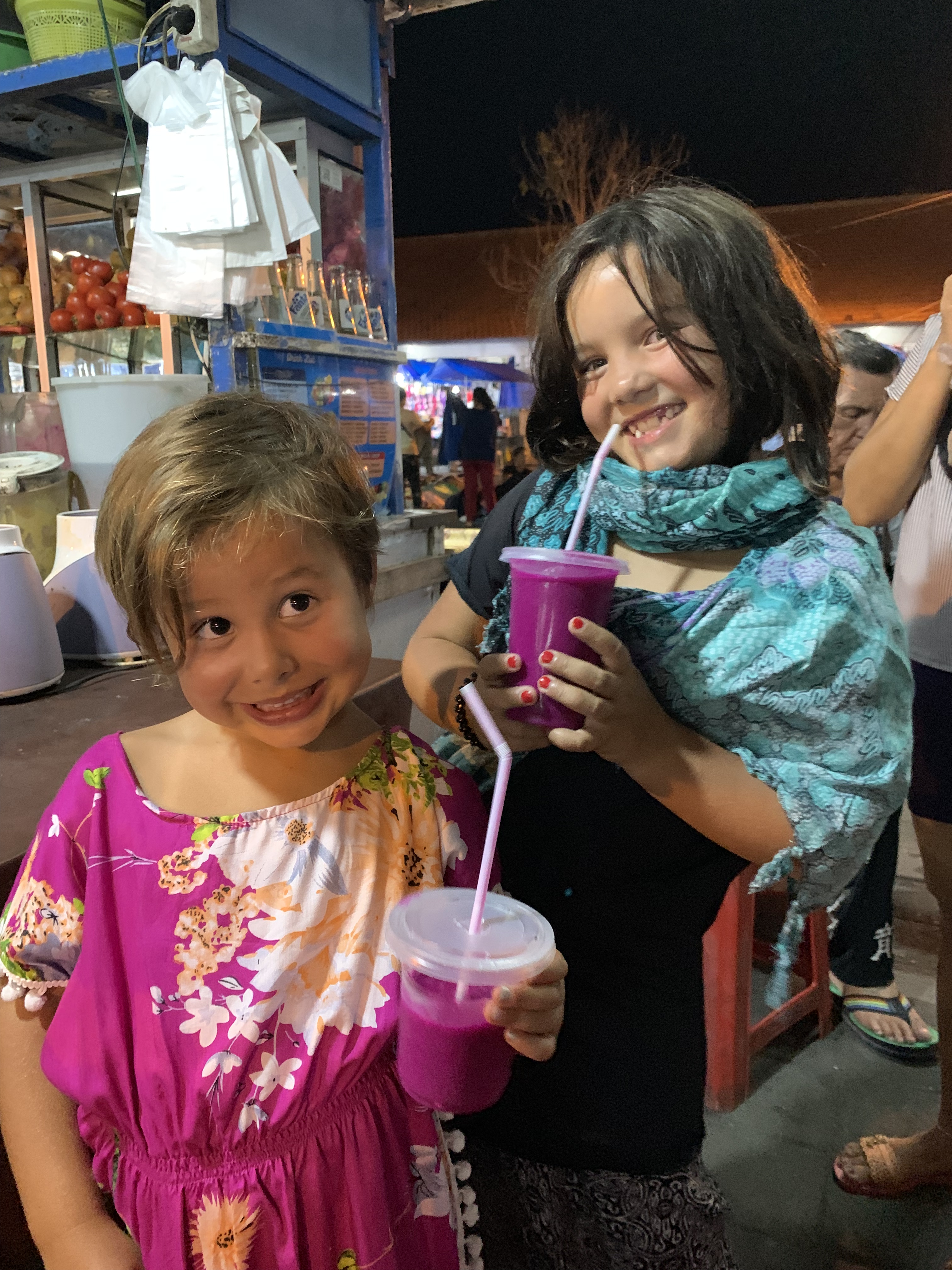 The food is amazing, the atmosphere festive and there’s something lovely about the appreciation of good food by tourists and locals alike. Some of the magic must be that its dark and the food is flipping and frying on all sides as you stroll through the stalls. The smells of…well mostly hot oil, 🙂 but spices and chicken and incense. Some of the special magic is surely the novelty, both of the mulling about gawking but in the new foods and drinks and flavors. But beyond all that it has just been a special adventure for our whole family to enjoy. We’ve been enough times (and plan to go tonight one more time) that the girls know the majority of the stalls and delight in going to the fry lady and picking out, ordering, and paying for their lumpia, wontons and donut holes all by themselves (that’s right, thats a one stop shop) suksima!! We’ve loved sitting on our plastic stools, sipping some vibrant smoothie, talking about the sights we’ve seen, the books we’ve read, trying to come up with new “Stories when you were little” to entertain and the places we’re looking forward to going the next day.