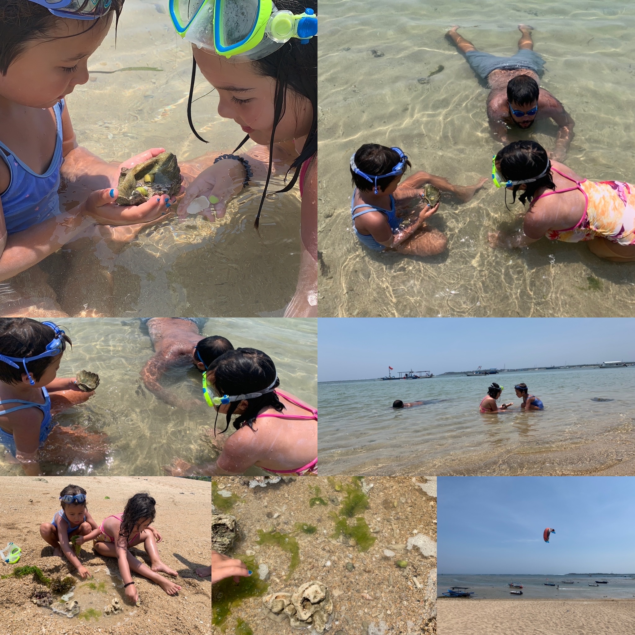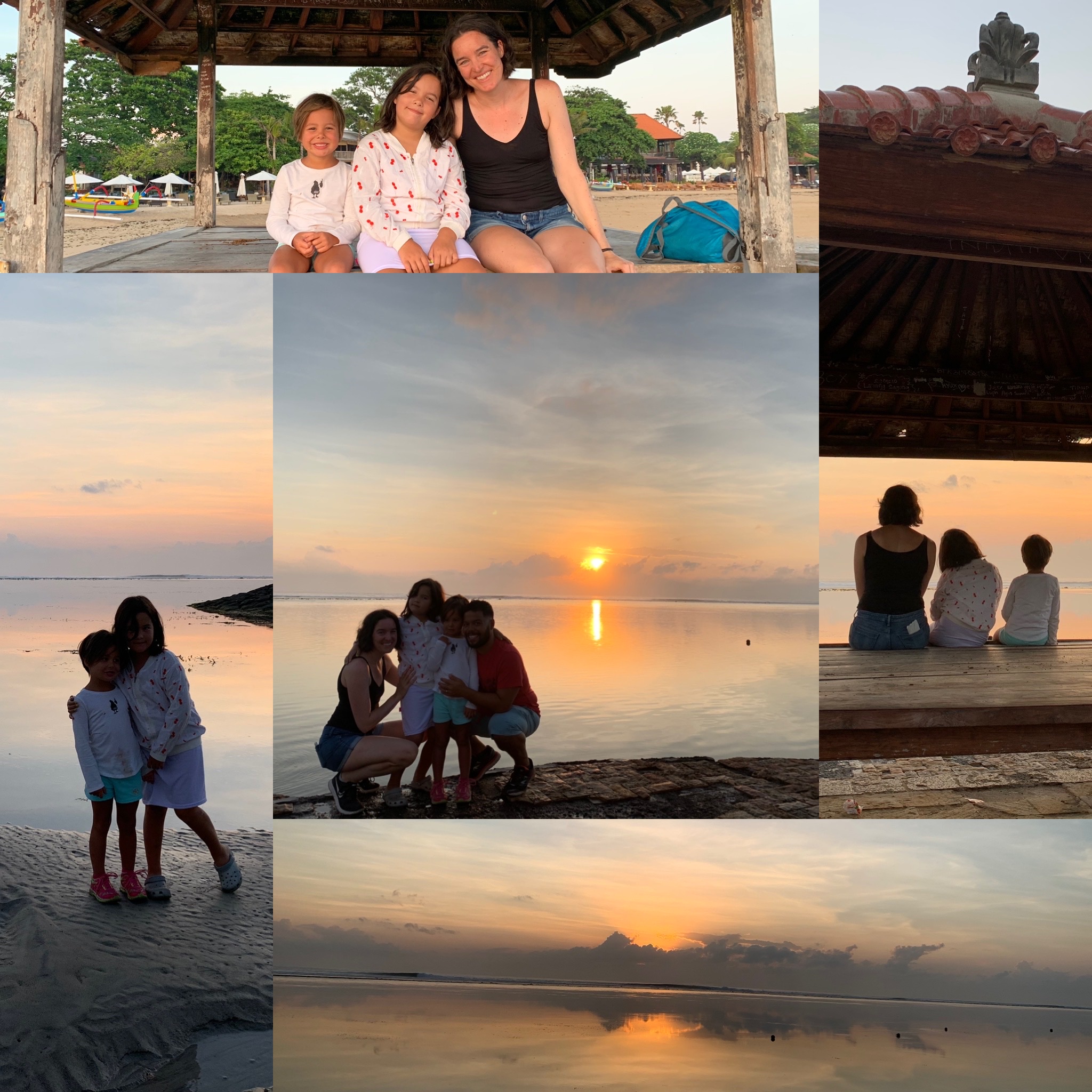 We spent T &As last evening taking in the sunset in Kuta: Jimbaran beach, the only stretch Chiko says that is public (not owned by resorts…again so thankful to have Michiko taking us, showing us and driving us to places we certainly would have missed…forgot to even mention her neighbors deep fried scrambled eggs with sweet and sour sauce! Haha side bars…) so it, the beach, was crowded but awesome. Kids and families and tourists all enjoying the waves, soft sand, sort of old lumpia that people were selling from boxes on their heads and snapping pictures of the undeniably gorgeous view. Sadly we didn’t plan very well and didn’t have towels or changes of clothes so had to attempt to keep the girls from getting completely soaked and sandy. It was a partial success. Marion didn’t Mean to get knocked down by a wave and get head to toe drenched. Luckily we had one sarong that could become a dress :). Alys was a champ trying to at least keep her shorts damp not dripping 😂