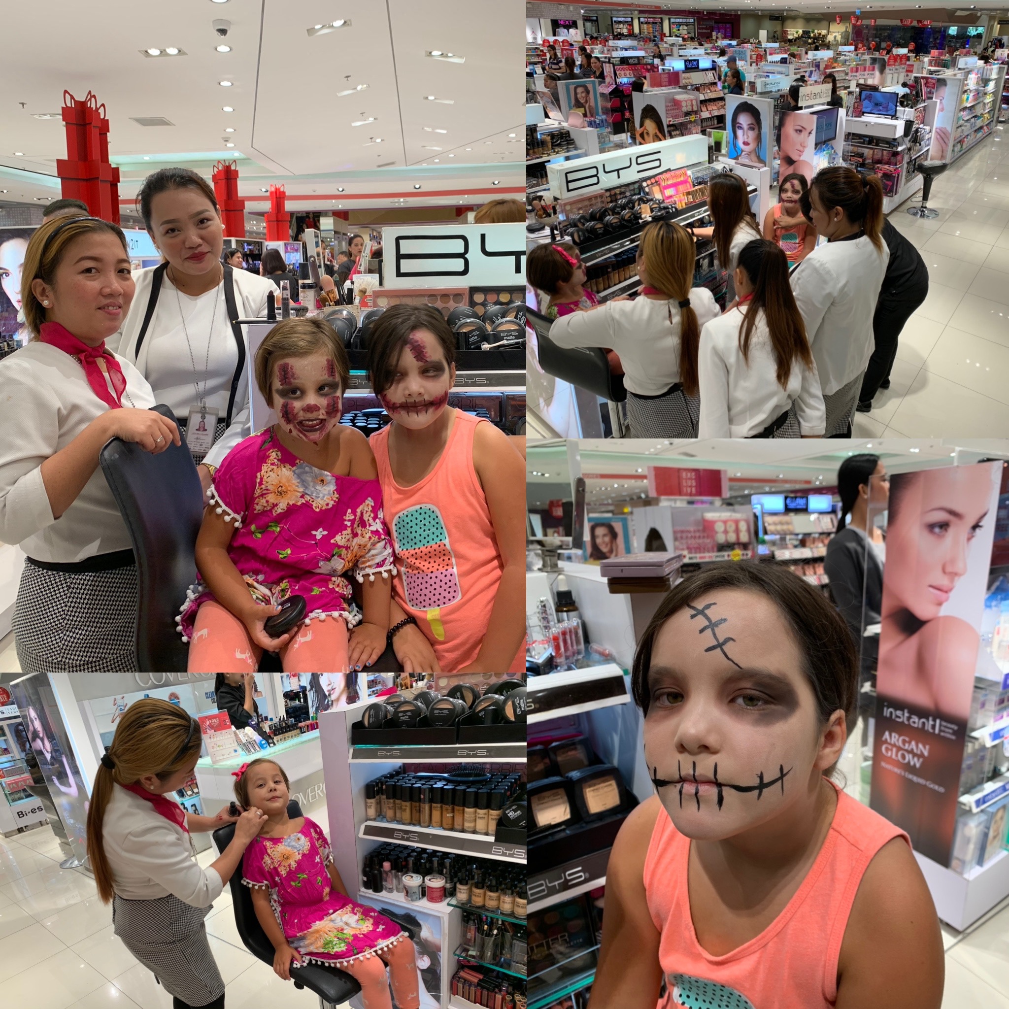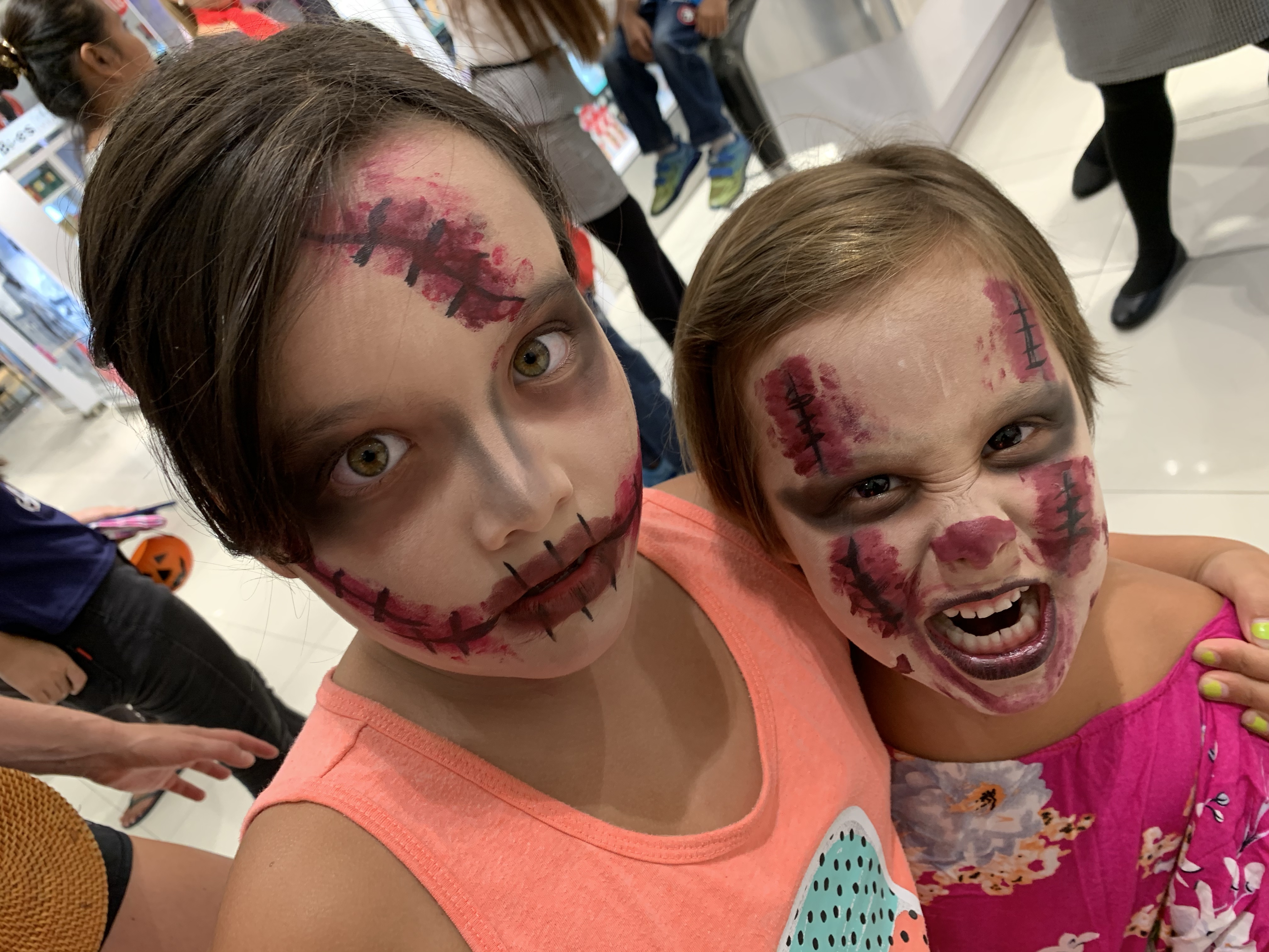 So…back to Halloween: the girls had varying ideas on costumes (what with limited improv gear) but mainly we thought we could make whatever work if we could get our hands on some Halloween makeup (then they could be the ghosts or zombies or princesses they wished). we were striking out on our own so we went into a department store and asked innocently enough, “Do you have Halloween makeup?” Near the cosmetic stands. We were led between the racks of products and handed off to another salesperson who proceeded to help Marion into a stool and started doing her make up. What followed was a 30-45 minute session including at times up to 7 or 8 salesladies giving their input and expertise while consulting phone images of zombies (what the girls requested) on their phones. It was beyond hilarious. And fantastic. The girls were thrilled and the makeup like a movie. The girls each had about 10 layers of makeup caked on, and that whitening makeup they have here came in handy trying to get authentic wan living dead.