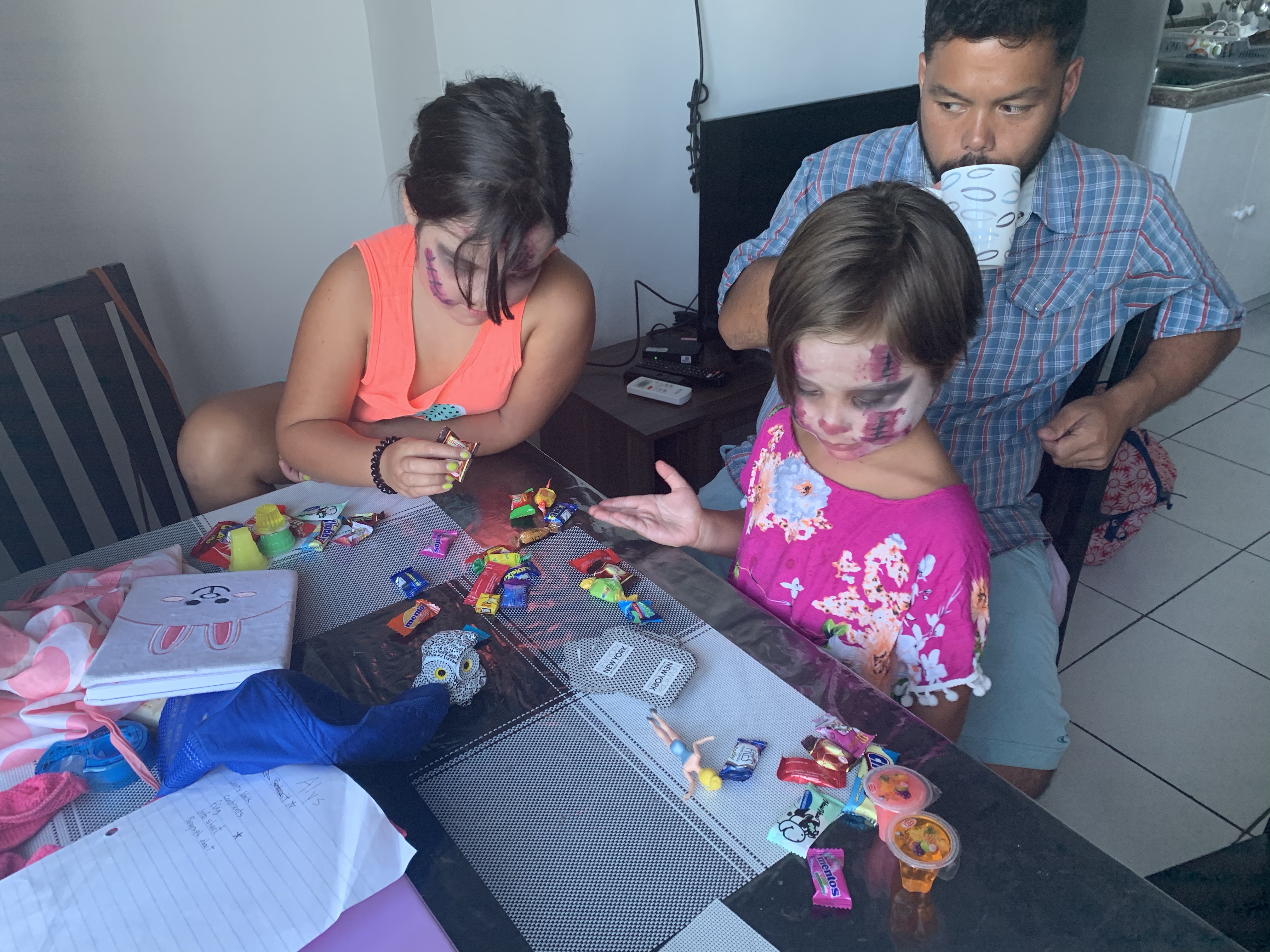 What with such great makeup we decided a trip back home for costumes was unnecessary. The girls bravely went store to store with bright “trick or treats!” (Marion with a bit more enthusiasm as Alys, probably like her mom, has a harder time with the “no” and being awkwardly turned away by the many stores that DIDN’T have candy). But we coached them on the “that’s ok, thank you! Happy Halloween!” And Marion was a delightful sprite-y self in her delivery that everyone seemed happy even when turned down. But don’t worry, they weren’t turned down ALL the time, and they came home with a very adequate haul.